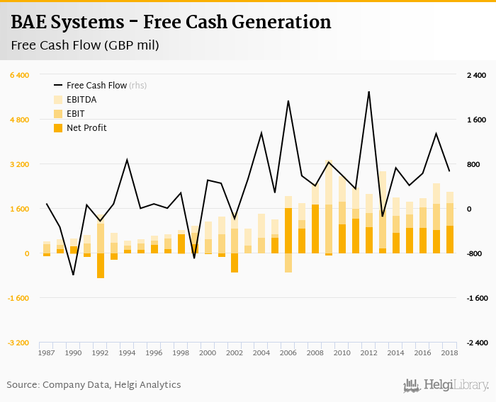 BAE Systems made a net profit of GBP 1,000 mil with revenues of GBP 16,821 mil in 2018, up by 20.9% and down by 2.34%, respectively, compared to the previous year. This translates into a net margin of 5.94%.