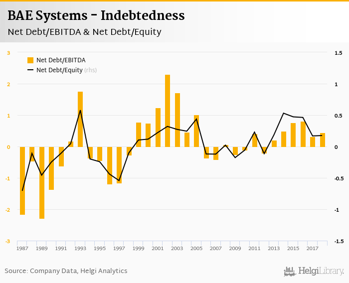 BAE Systems's net debt stood at GBP 980 mil and accounted for 0.174 of equity at the end of 2018. The ratio is up 0.006 pp compared to the previous year.