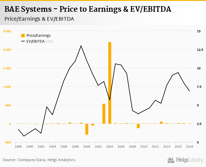 BAE Systems stock traded at GBP 4.58 per share at the end 2018 translating into a market capitalization of USD 18,628 mil.