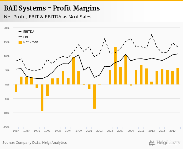 BAE Systems made a net profit of GBP 1,000 mil with revenues of GBP 16,821 mil in 2018, up by 20.9% and down by 2.34%, respectively, compared to the previous year.