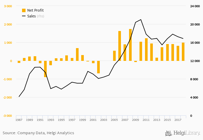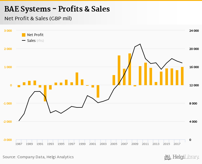BAE Systems made a net profit of GBP 1,000 mil in 2018, up 20.9% compared to the previous year. Total sales reached GBP 16,821 mil, which is down 2.34% when compared to the previous year.