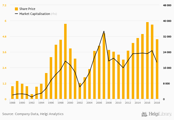 Since the end of 2013, stock has appreciated by 6.68% implying an annual average growth of 1.30% In absolute terms, the value of the company fell by USD 4,494 mil.