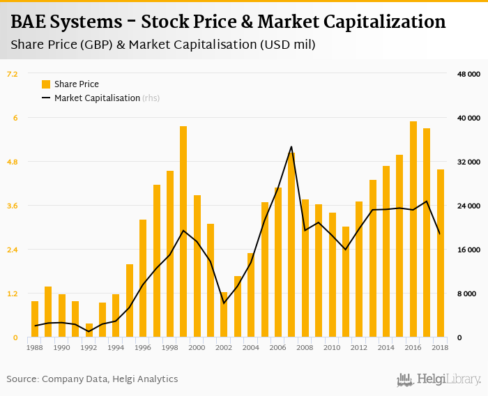 BAE Systems stock traded at GBP 4.58 per share at the end 2018 implying a market capitalization of USD 18,628 mil.