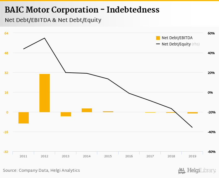 BAIC Motor Corporation's net debt stood at CNY -25,986 mil and accounted for -35.9% of equity at the end of 2019. The ratio is down 19.3 pp compared to the previous year.