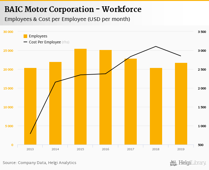 BAIC Motor Corporation employed 21,712 employees in 2019, up 6.27% compared to the previous year. Historically, between 2013 and 2019, the firm's workforce hit a high of 25,461 employees in 2015 and a low of 20,371 employees in 2013.