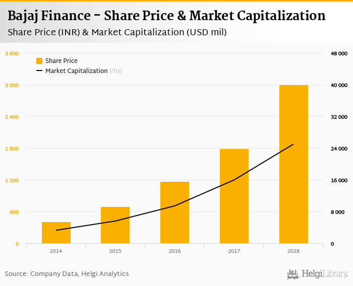 Bajaj Finance stock traded at INR 3,003 per share at the end of 2018 implying a market capitalization of USD 25,003 mil.