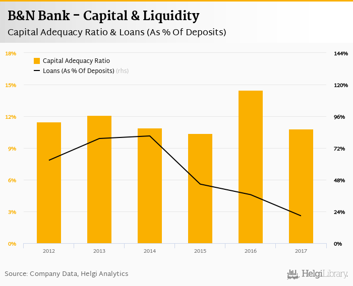 B&N Bank's capital adequacy ratio reached 10.8% at the end of 2017, down from 14.5% compared to the previous year. Historically, the bank’s capital ratio hit an all time high of 14.5% in 2016 and an all time low of 10.4% in 2015.
