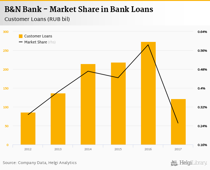 B&N Bank's customer loans reached RUB 121 bil in 2017, down 55.5% compared to the previous year.