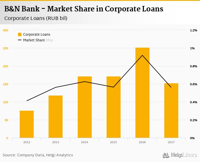 B&N Bank's corporate loans reached RUB 152 bil in 2017, down 39.6% compared to the previous year.