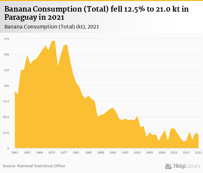 Total banana consumption fell 12.5% to 21.0 kt in Paraguay in 2021, according to Faostat.
