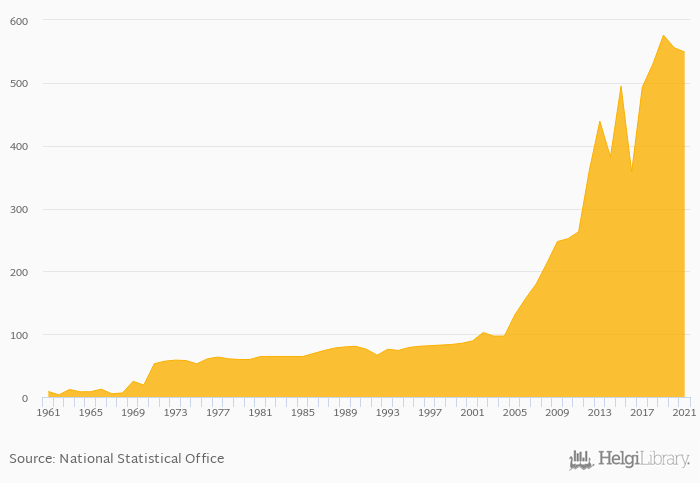 Historically, total banana consumption in Mozambique reached an all time high of 576 kt in 2019 and an all time low of 3.41 kt in 1962. When compared to Mozambique's main peers, total banana consumption in Malawi amounted to 387 kt, 469 kt in South Africa, 2,451 kt in Tanzania and 7.00 kt in Zambia in 2021.