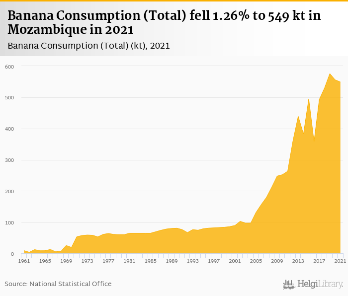 Total banana consumption fell 1.26% to 549 kt in Mozambique in 2021, according to Faostat.