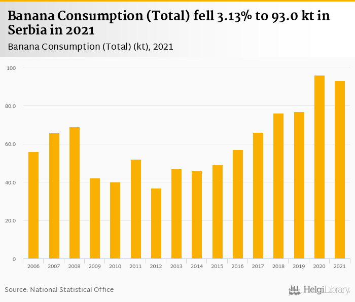 Total banana consumption fell 3.13% to 93.0 kt in Serbia in 2021, according to Faostat.
