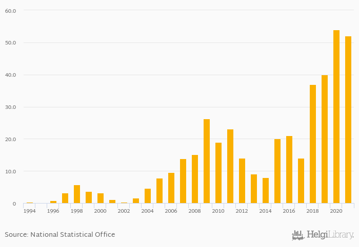 Historically, total banana consumption in Azerbaijan reached an all time high of 54.0 kt in 2020 and an all time low of 0.166 kt in 1995. When compared to Azerbaijan's main peers, total banana consumption in Azerbaijan amounted to 52.0 kt, 27.0 kt in Georgia, 389 kt in Iran and 1,398 kt in Russia in 2021.