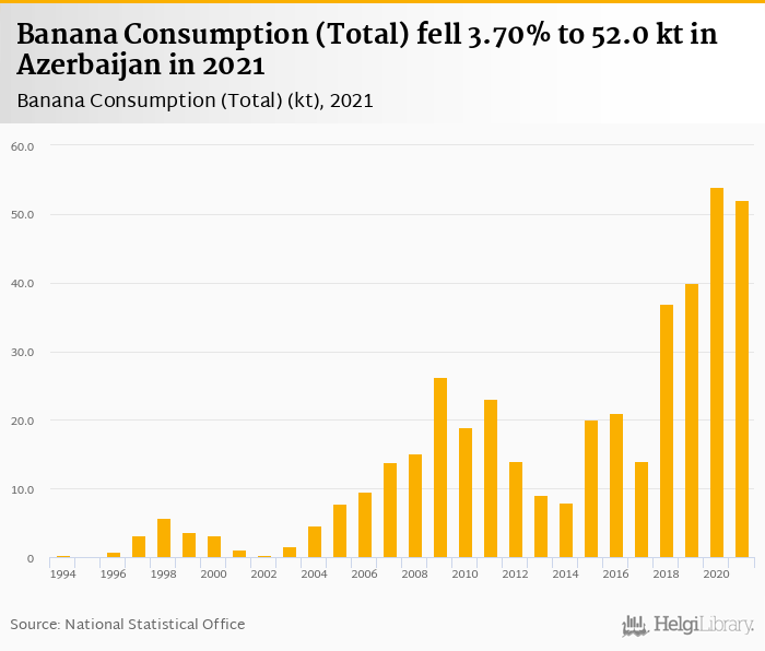 Total banana consumption fell 3.70% to 52.0 kt in Azerbaijan in 2021, according to Faostat.