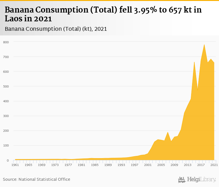 Total banana consumption fell 3.95% to 657 kt in Laos in 2021, according to Faostat.