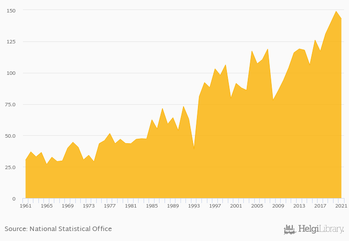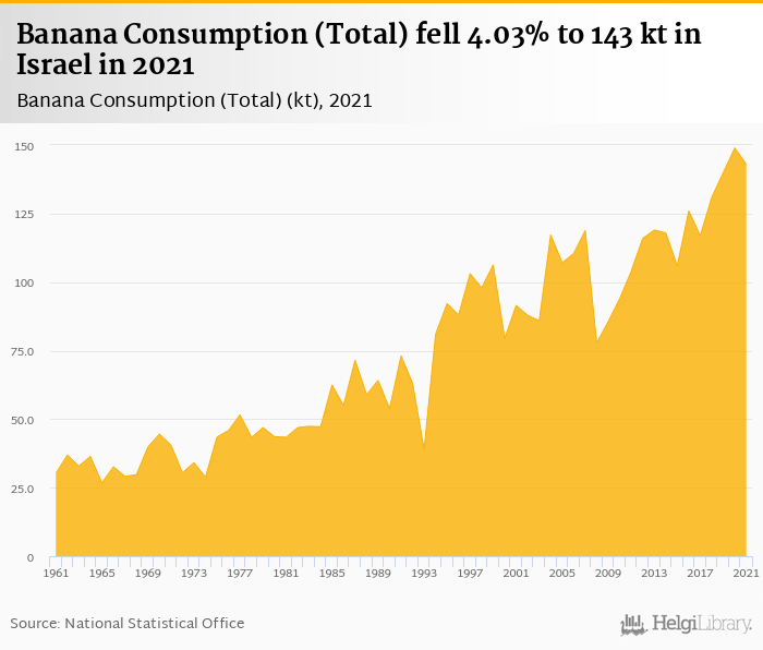 Total banana consumption fell 4.03% to 143 kt in Israel in 2021, according to Faostat.