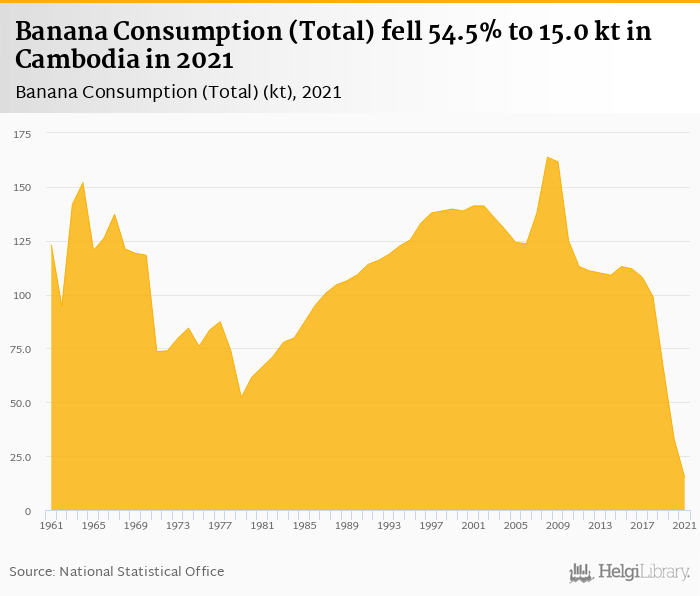 Total banana consumption fell 54.5% to 15.0 kt in Cambodia in 2021, according to Faostat.