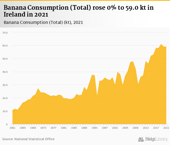 Total banana consumption rose 0% to 59.0 kt in Ireland in 2021, according to Faostat.