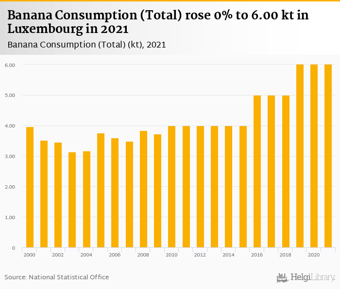 Total banana consumption rose 0% to 6.00 kt in Luxembourg in 2021, according to Faostat.