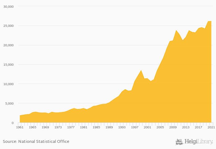 Historically, total banana consumption in India reached an all time high of 26,109 kt in 2021 and an all time low of 1,794 kt in 1961.