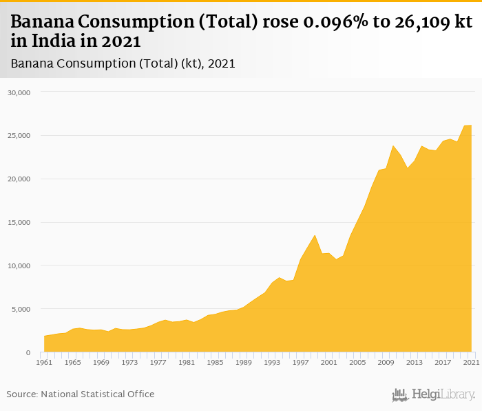 Total banana consumption rose 0.096% to 26,109 kt in India in 2021, according to Faostat.