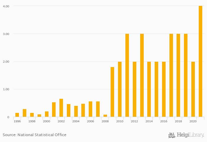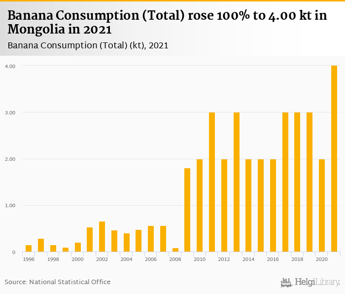 Historically, total banana consumption in Mongolia reached an all time high of 4.00 kt in 2021 and an all time low of 0.085 kt in 2008. When compared to Mongolia's main peers, total banana consumption in China amounted to 10,850 kt, 57.0 kt in Kazakhstan, 29.0 kt in Kyrgyzstan and 1,398 kt in Russia in 2021.
