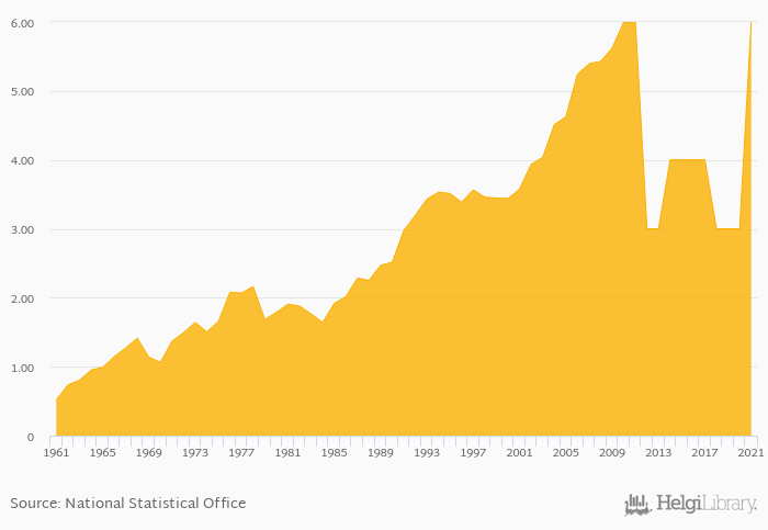 Historically, total banana consumption in Iceland reached an all time high of 6.00 kt in 2021 and an all time low of 0.519 kt in 1961. When compared to Iceland's main peers, total banana consumption in Denmark amounted to 76.0 kt, 76.0 kt in Norway, 74.0 kt in Sweden and 869 kt in United Kingdom in 2021.