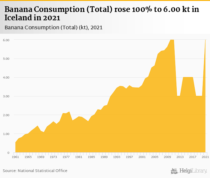 Total banana consumption rose 100% to 6.00 kt in Iceland in 2021, according to Faostat.