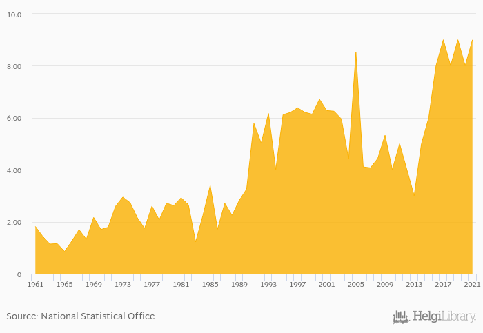 Historically, total banana consumption in Malta reached an all time high of 9.00 kt in 2021 and an all time low of 0.856 kt in 1965. When compared to Malta's main peers, total banana consumption in Greece amounted to 164 kt, 673 kt in Italy, 76.0 kt in Tunisia and 848 kt in Turkey in 2021.