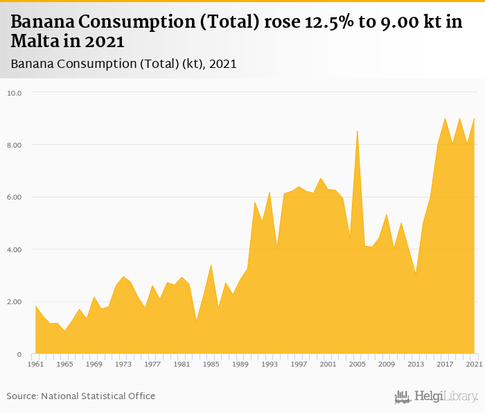 Total banana consumption rose 12.5% to 9.00 kt in Malta in 2021, according to Faostat.
