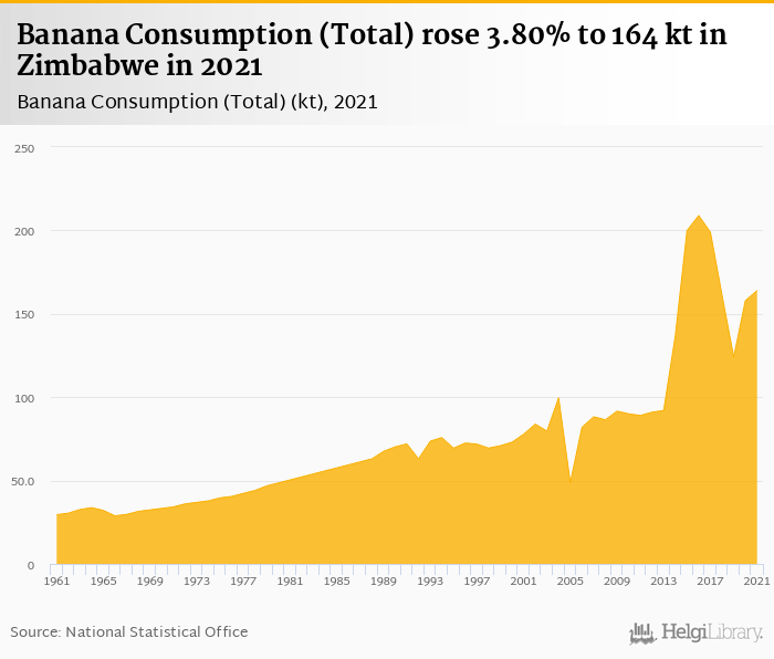 Total banana consumption rose 3.80% to 164 kt in Zimbabwe in 2021, according to Faostat.
