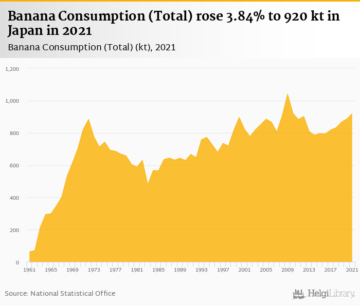 Total banana consumption rose 3.84% to 920 kt in Japan in 2021, according to Faostat.
