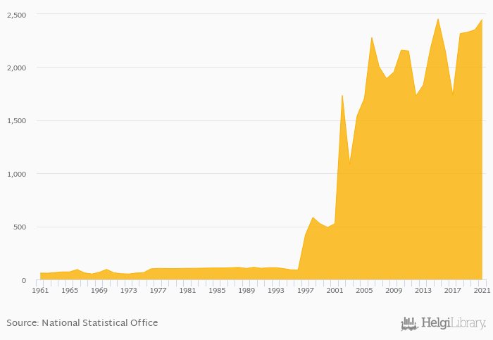 Historically, total banana consumption in Tanzania reached an all time high of 2,455 kt in 2015 and an all time low of 51.4 kt in 1968.