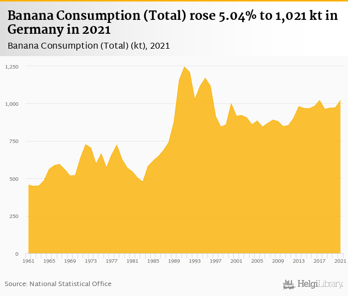Total banana consumption rose 5.04% to 1,021 kt in Germany in 2021, according to Faostat.