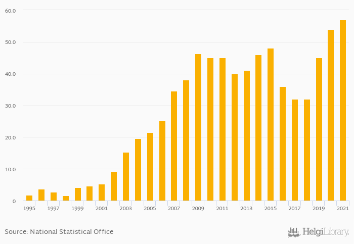 Historically, total banana consumption in Kazakhstan reached an all time high of 57.0 kt in 2021 and an all time low of 1.60 kt in 1998. When compared to Kazakhstan's main peers, total banana consumption in China amounted to 10,850 kt, 29.0 kt in Kyrgyzstan, 1,398 kt in Russia and 49.0 kt in Uzbekistan in 2021.