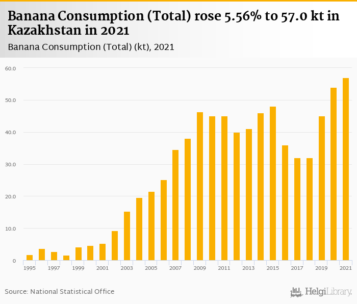 Total banana consumption rose 5.56% to 57.0 kt in Kazakhstan in 2021, according to Faostat.