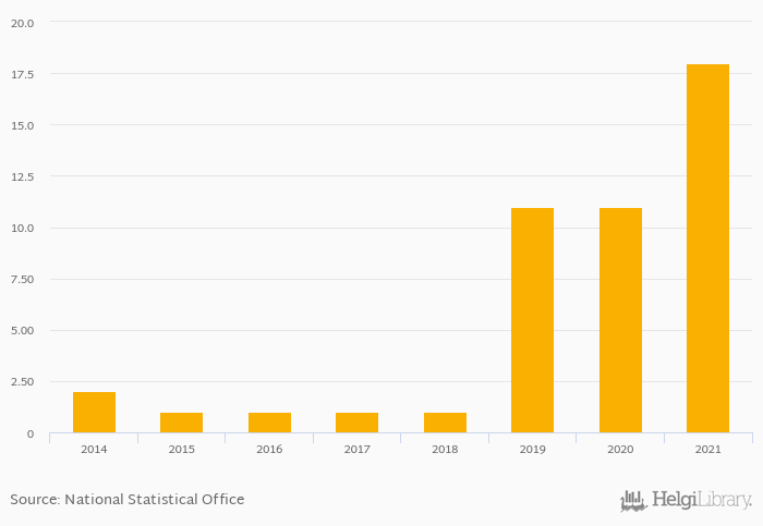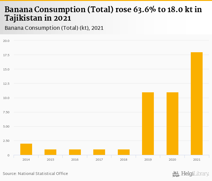 Historically, total banana consumption in Tajikistan reached an all time high of 18.0 kt in 2021 and an all time low of 1.00 kt in 2015. When compared to Tajikistan's main peers, total banana consumption in Afghanistan amounted to 50.0 kt, 10,850 kt in China, 29.0 kt in Kyrgyzstan and 49.0 kt in Uzbekistan in 2021.