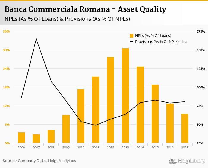 Comparing Banca Commerciala Romana with its closest peers, Banca Transilvania operated at the end of 2017 with NPL ratio of 8.22% and provision coverage of 70.9%, BRD Groupe Societe Generale with 8.13% and 95.0% respectively and Raiffeisen Bank Romania had 6.50% of bad loans covered with 57.6% by provisions at the end of 2017.