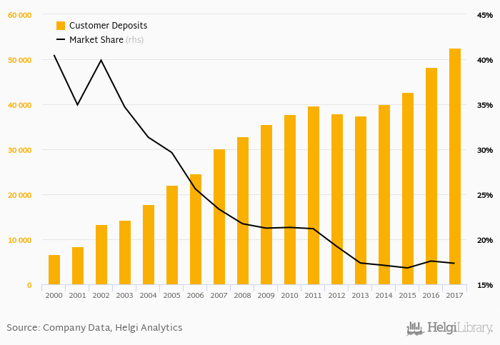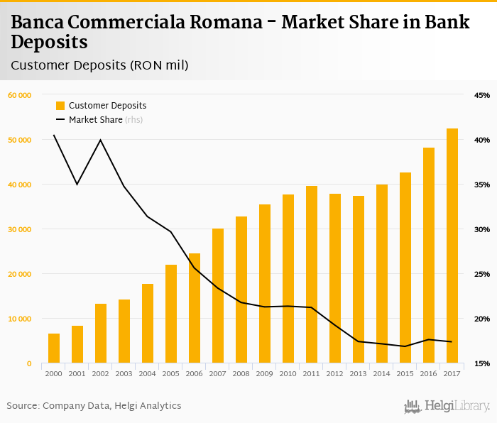 Banca Commerciala Romana accounted for 17.3% of all customer deposits taken by banks in Romania at the end of 2017. Historically, the bank’s market share in customer deposits reached an all time high of 40.5% in 2000 and an all time low of 16.8% in 2015.