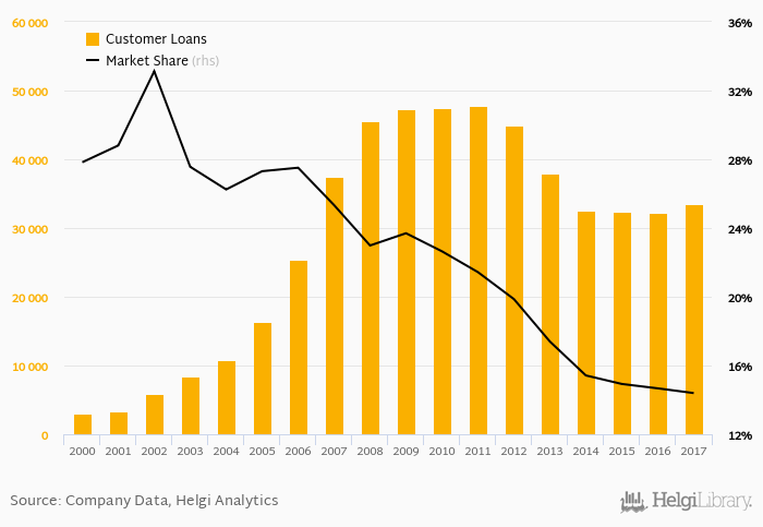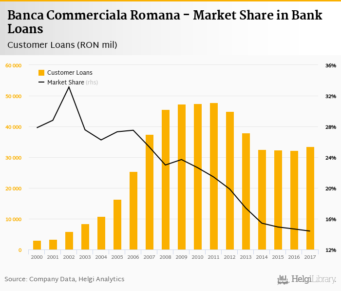 Banca Commerciala Romana accounted for 14.4% of all customer loans issued in Romania at the end of 2017. Historically, the bank’s market share in customer loans reached an all time high of 33.1% in 2002 and an all time low of 14.4% in 2017.