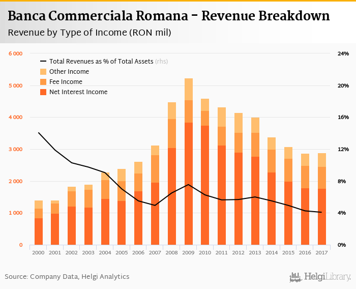 Comparing Banca Commerciala Romana with its closest peers, Banca Transilvania generated total revenues of 4.96% of assets in 2017, BRD Groupe Societe Generale operated with 5.07% revenue margin and Raiffeisen Bank Romania produced total income worth 5.78% of assets.