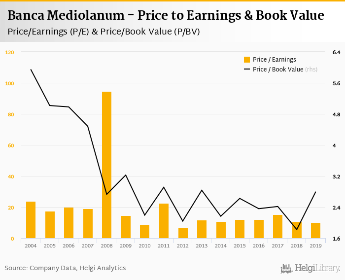 Banca Mediolanum stock traded at EUR 8.86 per share at the end 2019 implying a market capitalization of USD 7,361 mil.