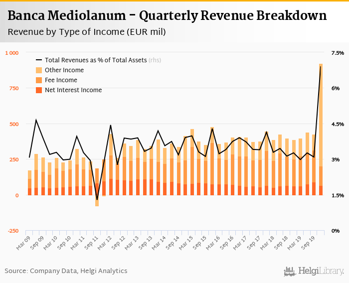 Banca Mediolanum generated total banking revenues of EUR 923 mil in the fourth quarter of 2019, up 139% when compared to the same period of last year and 116% when compared to the previous quarter.