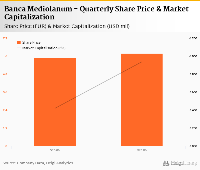 Banca Mediolanum stock traded at EUR 6.18 per share at the end of fourth quarter of 2006 implying a market capitalization of USD 5,934 mil.