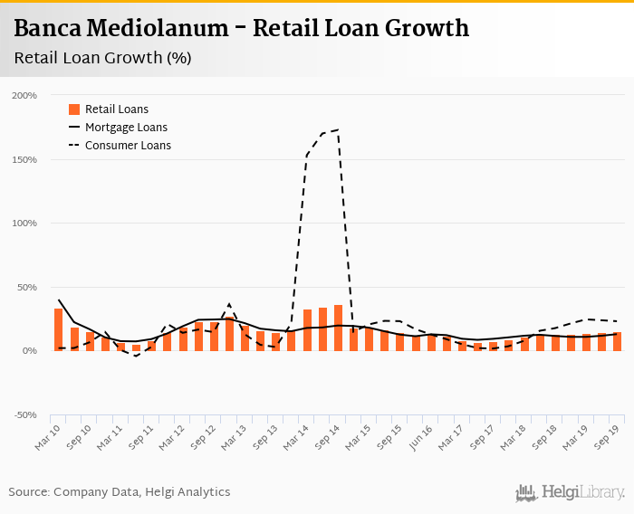 Banca Mediolanum's retail loans reached EUR 9,706 mil at the end of 2019-09-30, up 3.05% compared to the previous year. In the last decade, the average annual loan growth amounted to 0%.