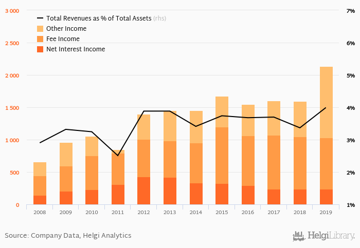 Net interest income represented 11.2% of total revenues, fee income contributed 37.1% and other non-interest income added further 51.7% to the overall revenue generation in 2019.