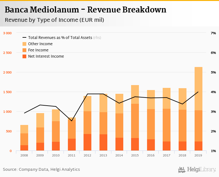Banca Mediolanum generated total banking revenues of EUR 2,134 mil in 2019, up 33.8% compared to the previous year.