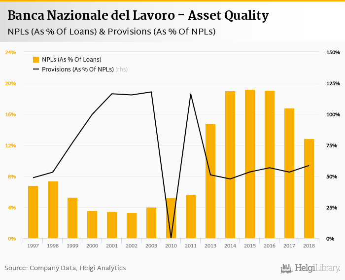 Banca Nazionale del Lavoro's non-performing loans reached 12.9% of total loans at the end of 2018, down from 16.8% compared to the previous year. Historically, the NPL ratio hit an all time high of 19.2% in 2015 and an all time low of 3.29% in 2002.