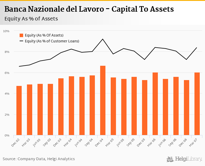 Banca Nazionale del Lavoro's Equity reached 13.2% of total assets in the 1Q2007, down from 14.7% for the previous year. As a share of net customer loans, the ratio amounted to 29.5% at the end of the first quarter of 2007.